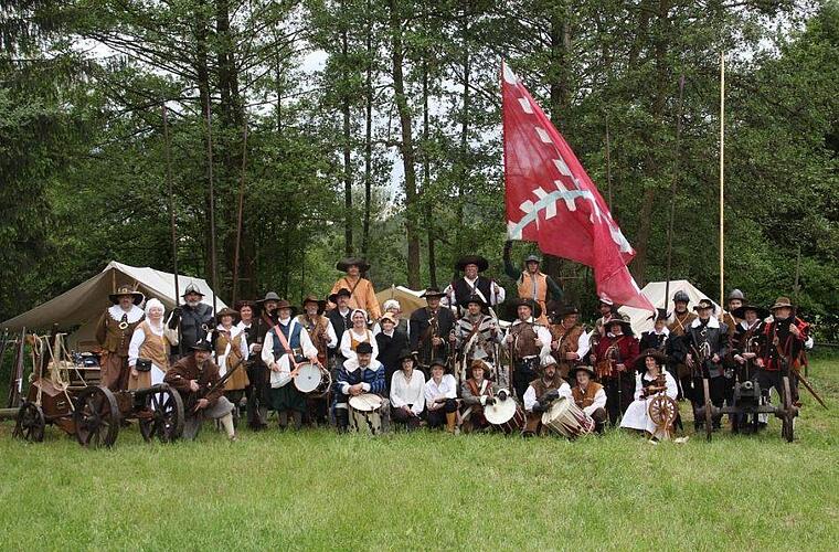 Bayerische Truppen nehmen am Sonntag, 16. Juni das Wahrzeichen Elfershausens ein. Es handelt sich dabei um Akteure eines Historienvereins, der Bilder aus dem 30-jährigen Krieg nachstellt, das "Kurbairische Dragonerregiment Johann Wolf " aus Mömlingen.