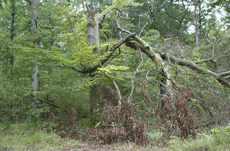 Davon steht einer direkt neben der Naturverjüngungsfläche in dessen Areal die Eichen prächtig heranwachsen.
