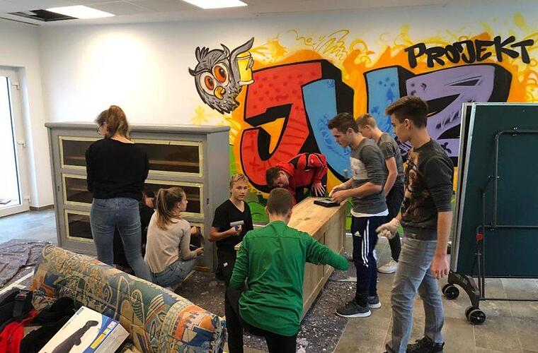 Im zweitgrößten Raum des Eulentreffs befindet sich das Jugendzentrum (JUZ), das Jugendliche aus dem Ort herrichteten. Es gibt eine "Spray-Wall", und Polstermöbel wurden gespendet. Die große Vitrine, der Mädchen und Jungen neue Farbe gaben, stammt aus dem Sitzungssaal des Rathauses, wo sie nach der Renovierung ausgedient hatte.