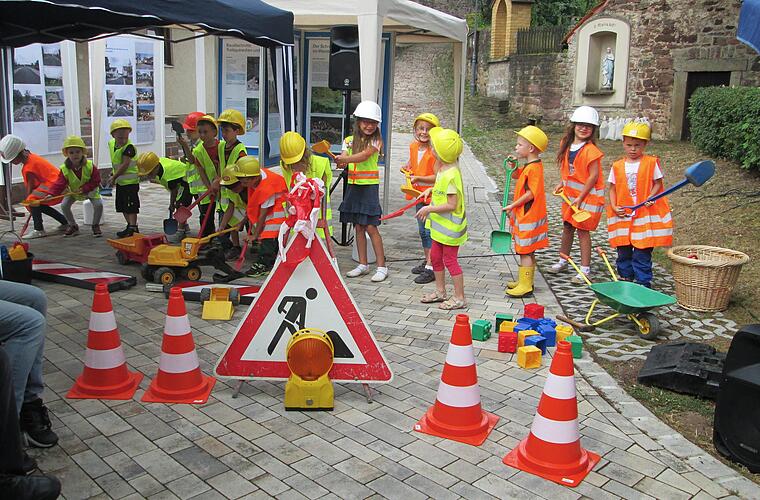 Den Kindern aus dem Kindergarten St. Laurentius gebührte der erste Auftritt bei der festlichen Feier am "Schafhof". Als Bauarbeiter-Kolonne stellten sie singend die Arbeitsphasen dar mit dem Refrain "Ich bau hoch, ich bau tief, immer gerade, niemals schief". Auf Schrifttafeln zeigten sie die Einzelprojekte, die teils lange Umwege in den Kindergarten verursachten - besonders für die Wittershausener Kinder.