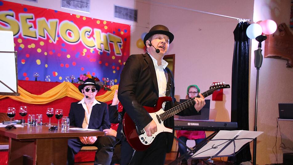 Aktuelles Dorfgeschehen brachte "Ritzelfuchs" Klaus Keller in die Bütt, etwa die Anekdote von der fehlenden Elferratskappe: Nach lager Suche stellten die Elferräte am Freitag fest, dass keine Kappe fehlt, sondern sie zu zwölft sind. Co-Sitzungspräsident Tim Eckert setzt einen drauf, indem er berichtete, dass auch für den Samstag ein Elferrat zu viel bestellt war. Das Hin und Her um die Einweihung der Sulzthaler Büttnerei in Fladungen kommentierte Keller kopfschüttelnd. Trotz des verschobenen Termins habe sich die Gemeinde aber im Freilandmuseum präsentiert wie keine andere zuvor. Sein Lied über die gekeulte Ziegen-Herde des Landkreises endete mit dem Refrain "Eieijajei, die Gäs' sen tot".