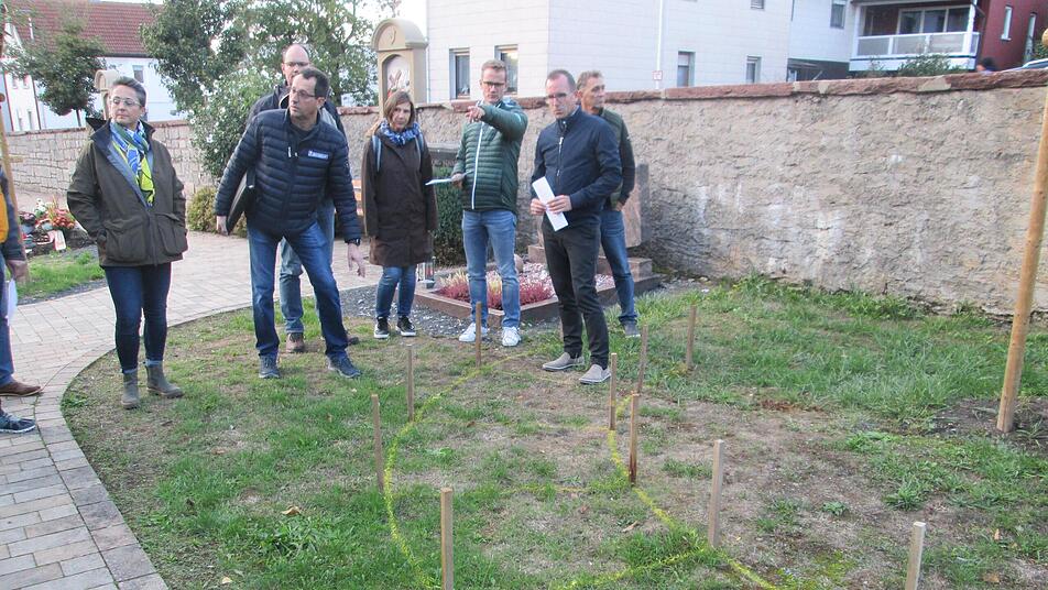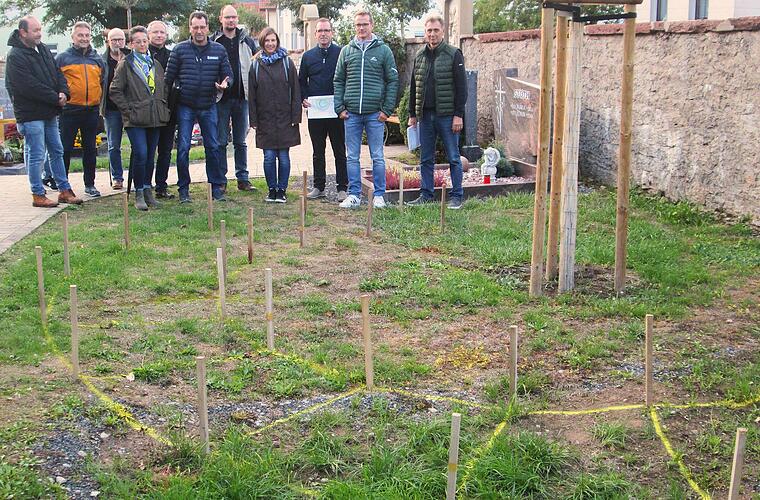 Ein Urnenfeld mit zehn Begräbnisstätten will die Gemeinde Fuchsstadt an der nordöstlichen Friedhofsmauer auf einer Freifläche platzieren. Bei einer Ortseinsicht verschaffte sich der Gemeinderat anhand einer provisorischen Markierung des Bauhofs einen Einblick, wie das Urnenfeld aussehen könnte.