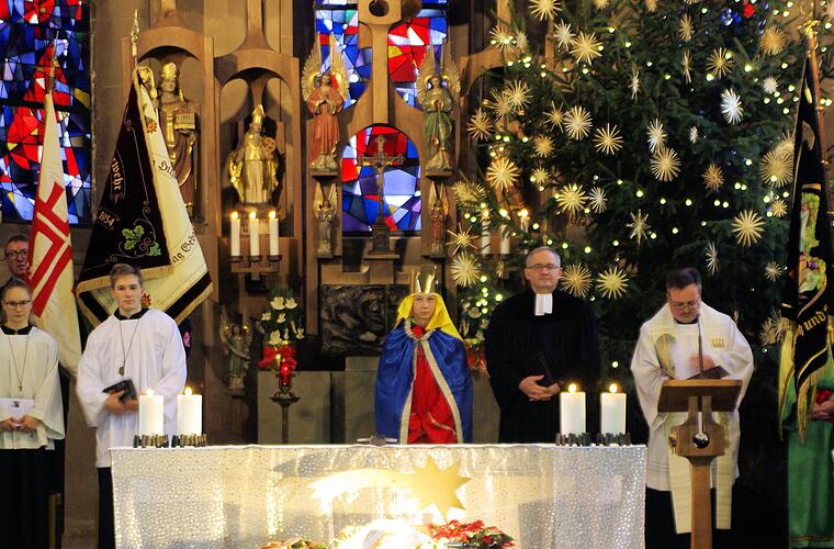Pfarrer Augustin erkor die Erscheinung des Herrn und den damit verbundenen "Dreikönigstag" zum Thema seiner Predigt. Die Könige aus dem Morgenland - wobei dies seinerzeit auch hochrangige Diplomaten oder Wissenschaftler sein konnten - nahmen, von einem Stern geführt, den weiten Weg nach Bethlehem auf sich, um dem "König der Juden" zu huldigen. Der lange, nicht immer bequeme Weg des Orts bis zum heutigen Markt, biete sich als geschichtliche Parallele an. Der Markt ist heute nicht nur Ort des Glaubens, sondern ein mit Kompetenzen ausgestatteter Teil des politisch-gesellschaftlichen Lebens. Die Fürbitten trugen Mitglieder der eigens zum Jubiläum gegründeten Arbeitskreises vor, die Vize-Bürgermeister Jürgen Englert koordinierte. Pfarrer Wahler weihte die symbolischen Gaben und segnete die Sternsinger. Er dankte den Helfern für die Vorbereitung des festlichen Gottesdienstes, den Gläubigen für ihren Besuch und den Musikern von "Just for fun" für die musikalische Begleitung. Im Anschluss trafen sich die Gläubigen beider Konfessionen auf dem Kirchplatz zum Austausch.