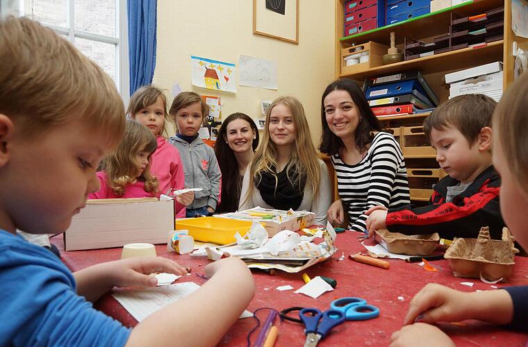 Die Kinder freuen sich Dora Szabo-Földes zu sehen und zeigen ihr, was sie gerade basteln. Die 19-jährige Ungarin verstärkt noch bis Ende Juli das Team des Kindergartens St. Josef. Auch in zwei weiteren Einrichtungen arbeiten derzeit junge Menschen aus dem europäischen Ausland.
