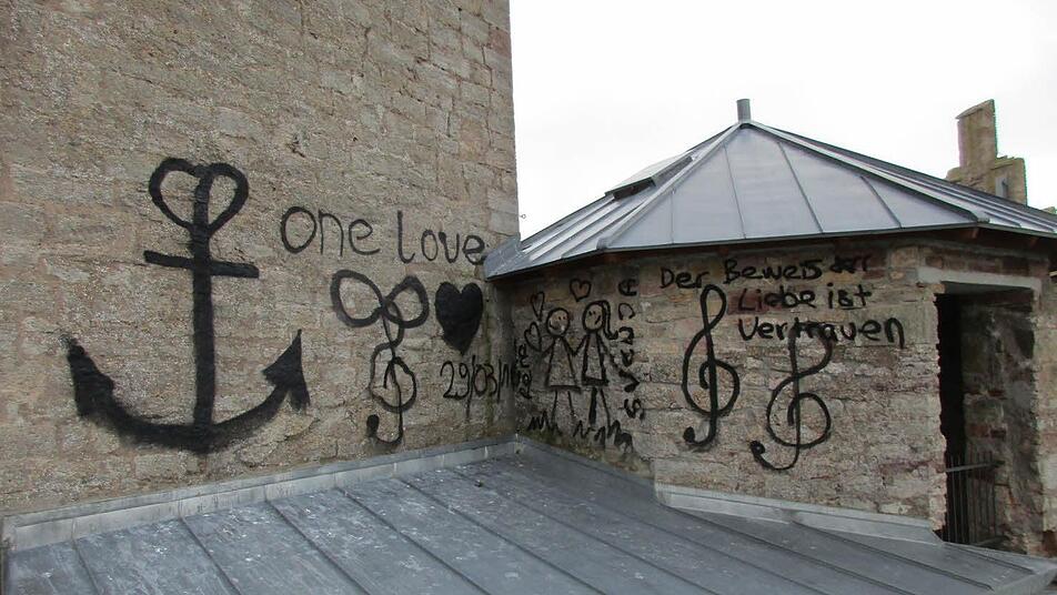 Unbekannte haben die Turm-Außenmauern mit überdimensionalen Notenschlüsseln und anderen "Sprayereien" verunstaltet. Mit Zustimmung der Landes-Denkmalpflege lässt der Markt die Schmierereien jetzt beseitigen, was die Gemeinde mehr als 2500 Euro kostet. Nach Einholung zweier Fachfirmen-Angebote entschied sich der Gemeinderat für eine Laserreinigung, die die Firma Kessler aus Stangenroth durchführt.