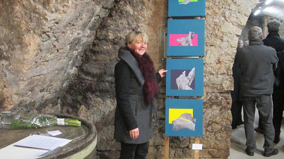 Der gegenüber liegende Winzerkeller ist von Petra Markert in Licht und Glas getaucht. Die Kissingerin zeigt ihr Können durch atmosphärische Bilder, ausgefallene Beleuchtungskörper und mit einer aus Scherben und nachgebildeten Weinflaschen designten Festtafel. Das Glas, bei 800 Grad im Ofen geschmolzen, versetzt sie mit eingebrachten Farben und Malereien und kommt dabei zu erstaunlichen Ergebnissen.