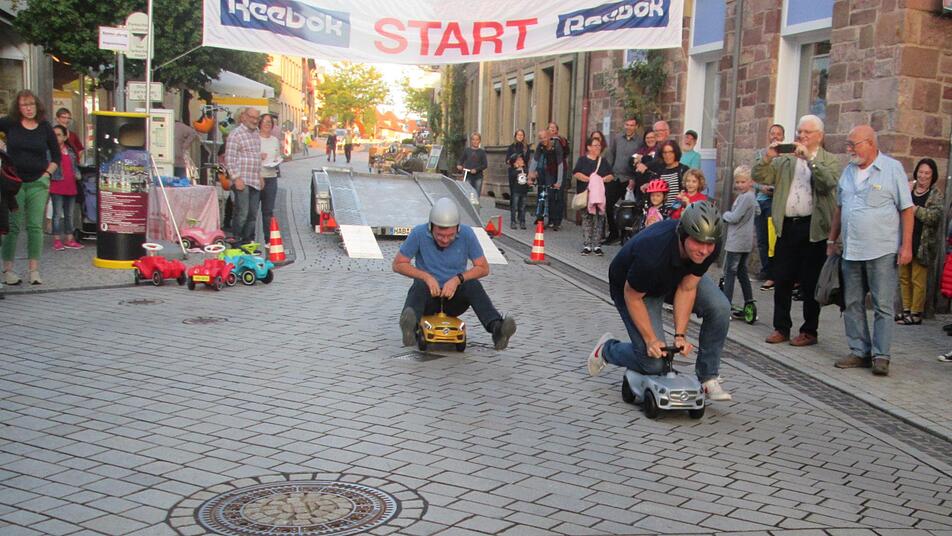 Abgesehen von der Gastronomie rund um die "gute Stube" Marktplatz, die - auch wegen der Bocksbeutel-Rallye an den beiden folgenden Tagen - bis in die Nacht gut zu tun hatte, kristallisierten sich zwei "Zugpferde" heraus, das Bobby-Car-Rennen und der Flohmarkt für Ladies auf dem Buttenmarkt einschließlich einer Modenschau.