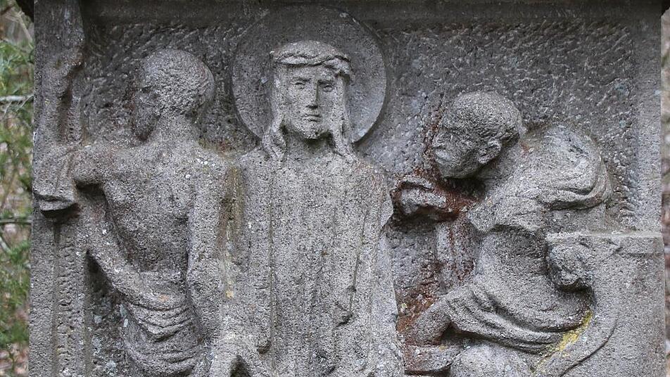 Religiöse Symbole sind in den Fluren allgegenwärtig. Entlang des Natur- und Kulturlehrpfades bei Fuchsstadt finden Spaziergänger Kreuzweg-Stationen von Ludwig und Otto Sonnleitner sowie ein in den Fels gehauenes Bibel-Zitat.