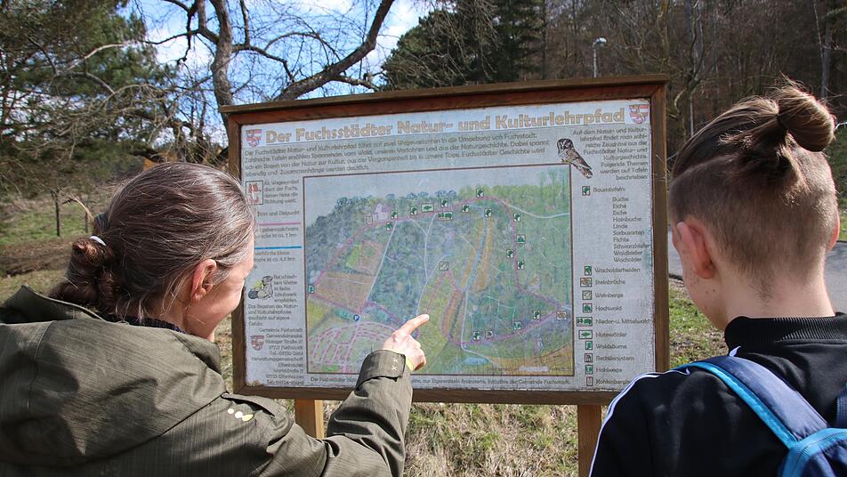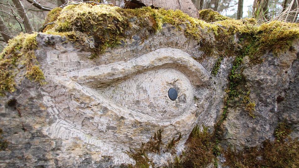 "Ich vermag alles durch den, der mich stark macht, Christus", steht - etwas versteckt - am Weg vom Waldstück "Goldklinge" ins Tal. Kurz vorher biegt die lange Variante des Fuchsstädter Natur- und Erlebnislehrpfades rechts in den Wald ab. "Früher standen sogar noch Sträucher vor der Schrift", berichtet Karlheinz Wagner, der das Zitat aus dem Brief an die Philipper (Kapitel 4, Vers 13) im Jahr 2011 in den Muschelkalk meißelte. Ein Auge auf einem Felsblock habe die Spaziergänger zur Suche animieren sollen. Mittlerweile sind die Sträucher weg, die Schrift ist besser lesbar.