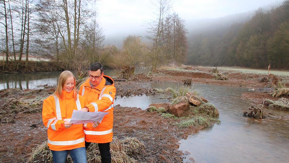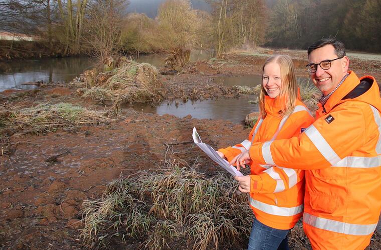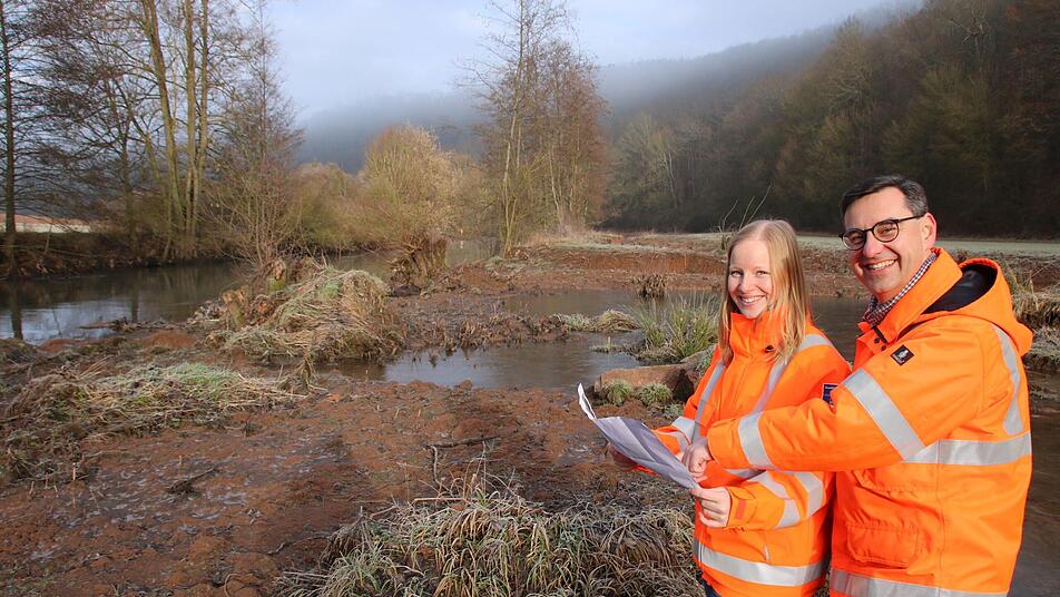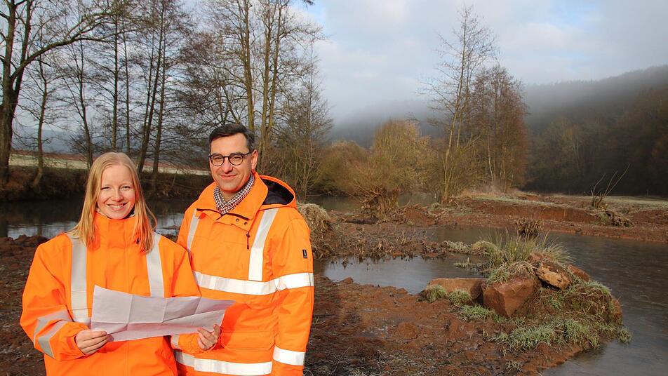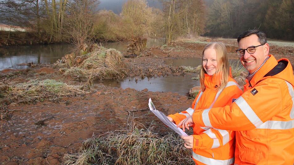 Bei Euerdorf hat das Staatliche Bauamt der Saale mehr Freiheit gegeben. Bauleiterin Sina Rohner und Abteilungsleiter Rüdiger Köhler begleiteten die Ausgleichsmaßnahme.