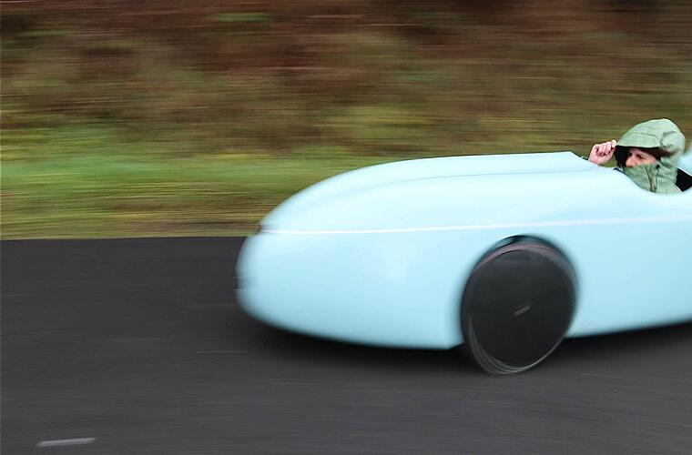 Neuentwicklung im Test "Ich bin stolz auf mein Modell S, auch wenn es mittlerweile eine Weiterentwicklung zum Modell DS gibt", sagt Uwe Karo aus Leverkusen (NRW). Dessen Frau Patricia hat sich bei dem nasskalten Wind in das warme Auto gesetzt und wartet lieber dort auf ihren Einsatz mit dem Velomobil. Zum Test stand noch eine weitere Neuentwicklung namens XL an. "Die Aerodynamik ist zu testen. Wichtig ist auch festzustellen, wie leicht das Velomobil rollt und welche Strecke es mit einer definierten Menge Energie zurücklegen kann", erklärt Karo. Auch die Bereifung spiele bei den Feinheiten des Rollwiderstandes eine nicht zu unterschätzende Rolle.