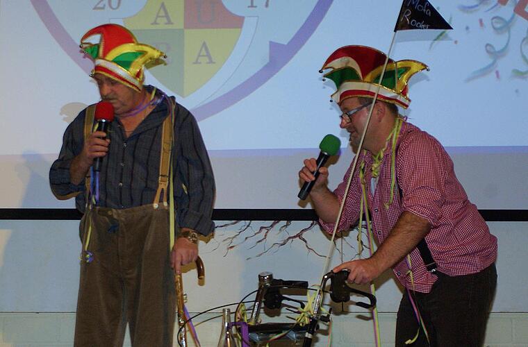 Die ehemaligen Vorsitzenden Hans-Jörg Kaiser und Rainer Kaiser mimten die Scheidenden, die als "Oldies" mit Rollator und Krücken die Fastnachtsbühne verlassen, um den "Youngsters" Platz zu machen. Einem Geschenkpaket entstiegen Marcel und Philipp - die Söhne von Hans-Jörg Kaiser und Sitzungspräsidenten - die symbolisch für den Wechsel standen.