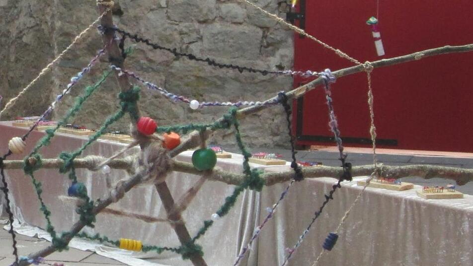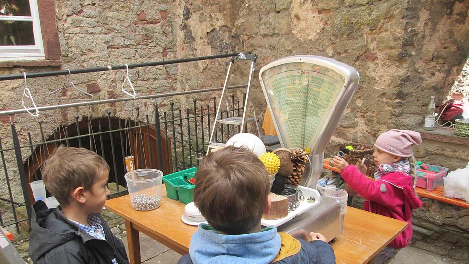 An fünf Workshops konnte die neugierige Kinderschar mit Materialien und Farbe experimentieren und so Gegensätze darstellen: Hell und dunkel, klein und groß, leicht und schwer. Was schwer ist und was leicht, zeigte eine Kaufmannswaage aus der Mitte des vorigen Jahrhunderts an. Die Kontraste bei den Farben wurden bei den gemalten, bunten Bildern im ehemaligen Pferdestall deutlich, und den Gegensatz "riesengroß und winzig" präsentierten die gebastelten Spinnennetze im Erthal-Saal.