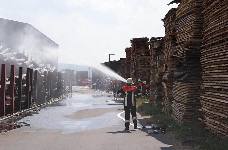 Ob solcher Umstände vergaßen die Floriansjünger schnell die harte Arbeit bei der vorangegangenen Sammelübung. Dabei wurde ein Feuer auf dem Gelände der Holzverarbeitungsfirma Kess angenommen, bei dem eine Maschine in Brand geraten war, der auf das Holzlager überzu-greifen drohte.