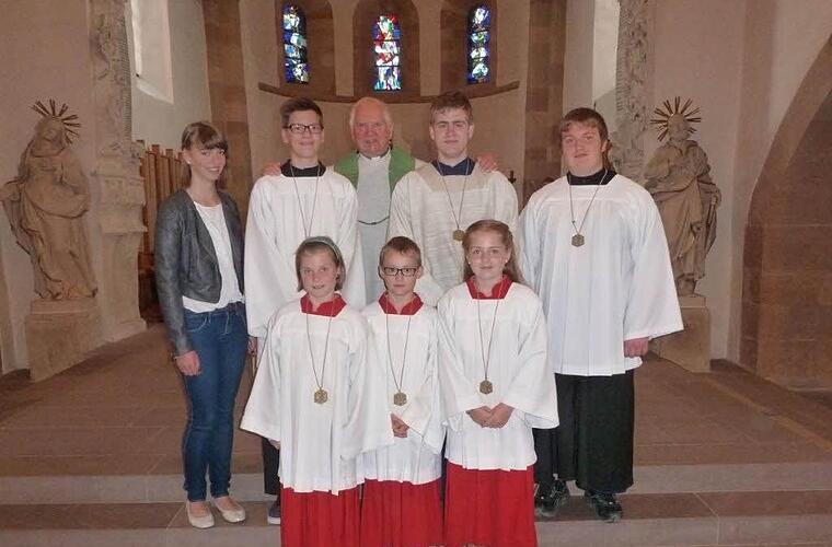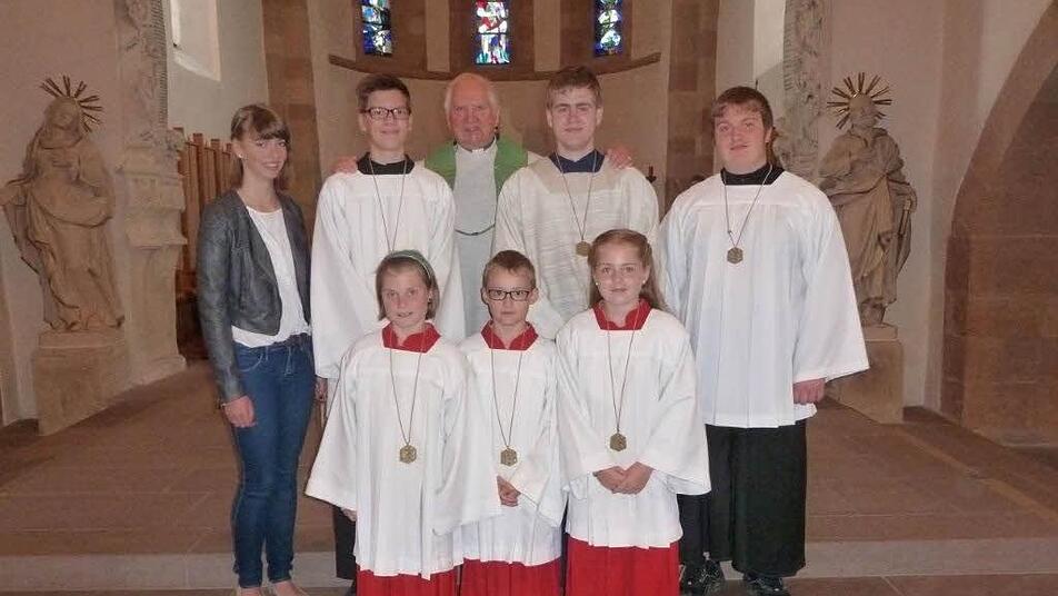 Über viele Jahre haben die Ausscheidenden Lena Knüttel, Fabio Weigand und Fritz Walther ihre Aufgabe wahrgenommen. Pfarrer Mauer freut sich über den Zuwachs. Der Pfarrer wies sie im Einführungsgottesdienst in ihre neuen Aufgaben und Pflichten ein. Die neuen Kräfte am Altar sind: Pia Muth, Jannik Müller, Elisa Schneider, Ian Knoblauch und Raphael Wigand.
