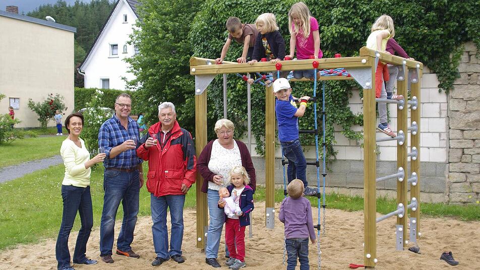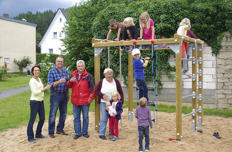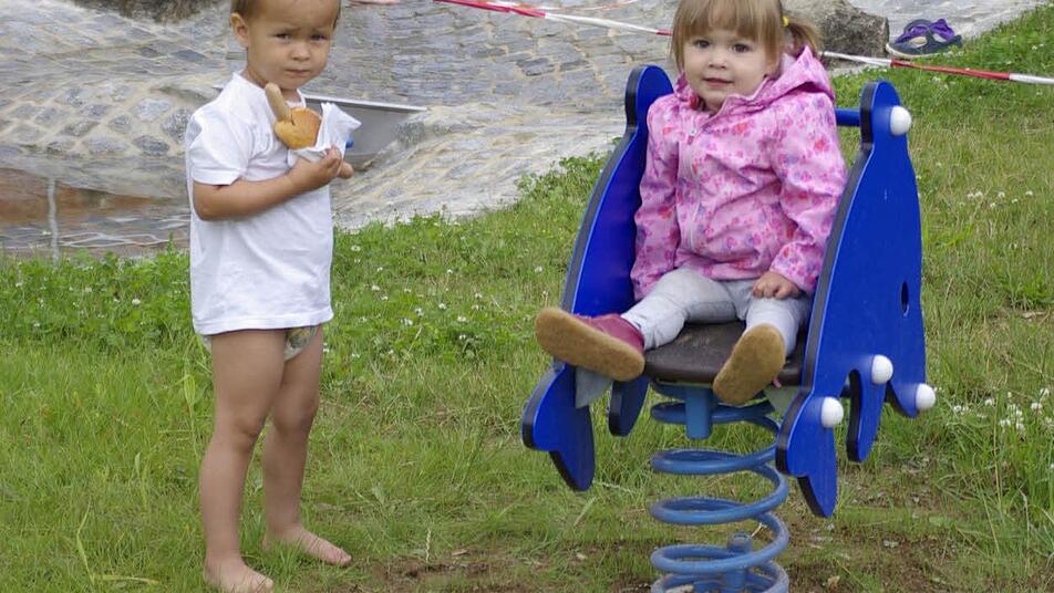 Das Klettergerüst und eine Delphin-Wippe begrüßten die Kinder zur offiziellen Übergabe mit großem "Hallo". Die Bereicherung in dem zentrumsnahen Areal kann den Jüngsten nur willkommen sein. Denn im Verbund mit dem Wasserspielplatz am Kneipp-Becken und dem Bolzplatz ergeben sich hier variable Möglichkeiten zum Spielen und Austoben.