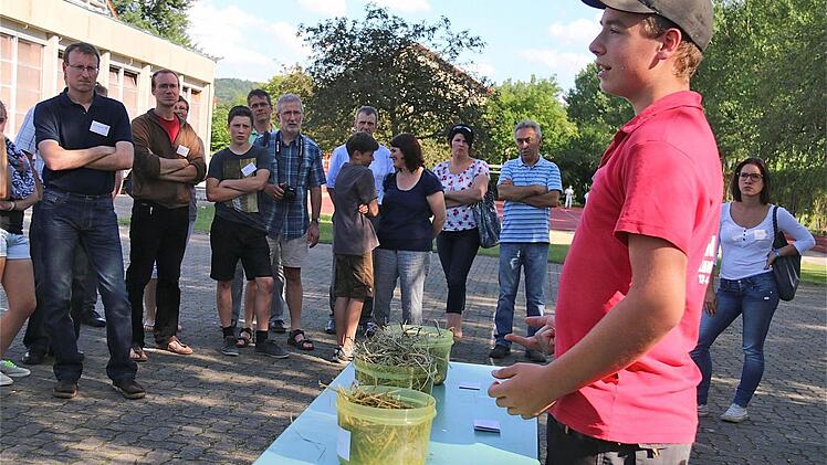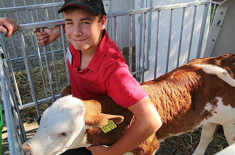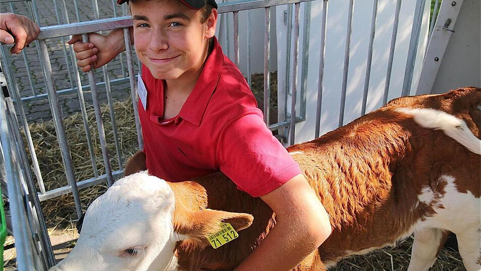 "Seit Februar war ich jeden Mittwoch zu Gast im Elfershausener Milchviehbetrieb Greu-bel", berichtet Praktikant Sandro Hufnagel ganz begeistert und präsentiert auch gleich zwei süße Milchkälbchen. "Es war abwechslungsreich und sehr interessant in diesem Betrieb", schildert Sandro, wie er am Melkroboter tätig war. "Ich werde mich nach einem Berufszweig umschauen, in dem ich auch mit Landmaschinen zu tun haben werde", bestätigt Sandro. Anhand seiner Aufzeichnungen auf der Schauwand berichtet er den Zuhörern mit viel Wissen über die vielfältigen Aufgaben des Milchbetriebes Greubel.