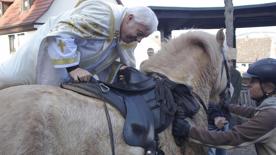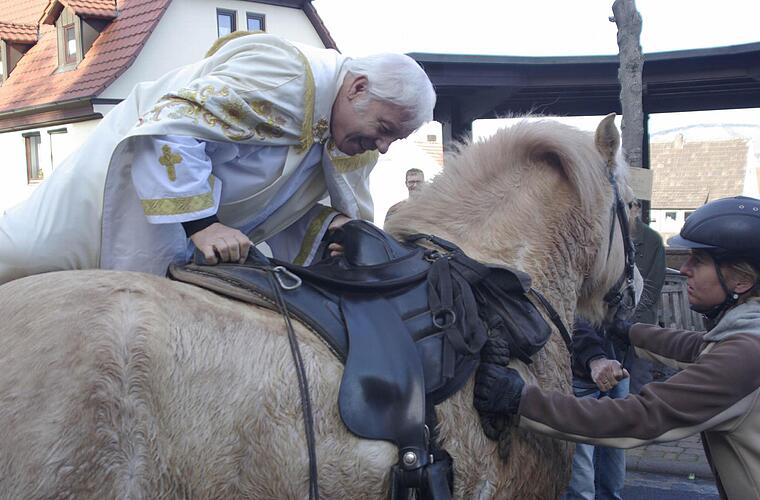 Pfarrer Erhard bewies Mut. Er schwang sich in den Sattel des Pferdes "Taco", dem aber offensichtlich der Ornat des Geistlichen nicht gefiel. Schon nach vier Schritten bockte das Tier, und Pfarrer Erhard - im Rodeo-Reiten offensichtlich nicht geschult, aber abgefangen von einigen Umstehenden - glitt zu Boden. "Das Gewand ist Taco nicht gewohnt", vermutete seine Besitzerin entschuldigend. Hochwürden kam, gottlob, mit dem Schrecken davon und verzieh dem gesegneten Tier.