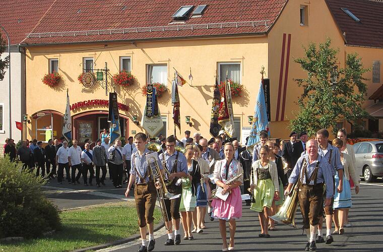 Dem Doppeljubiläum, das die Jugendkapelle aus Untererthal, Diebach und Obereschenbach musikalisch umrahmte, war ein feierlicher Gottesdienst und eine Kirchenparade vorausgegangen.
