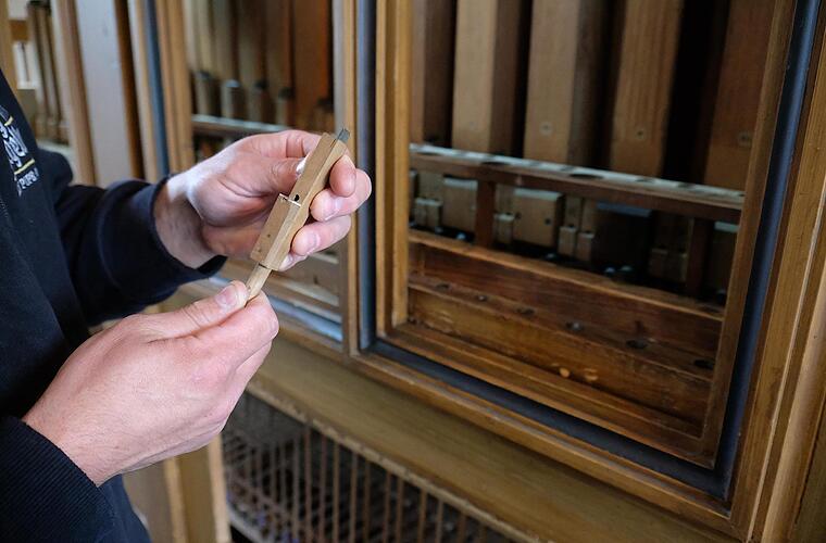 Zurzeit ist der offene Blick in das Innenleben dieser Orgel möglich. Juniorchef Christian Hey erläutert der Zeitung: "Die Mechanik hatte im Laufe der Jahrzehnte schwer gelitten und manche Orgelpfeifen waren schlichtweg verstopft". Das heißt also, dass hunderte Teile, Pfeifen und Holzhebel abgebaut und im Werk überholt werden müssen. Eine mühsame und zeitraubende Arbeit. Die Kostenkalkulation belaufe sich in der Größenordnung um die 40 000 Euro, sagt Kirchenpflegerin Gundhild Mützel auf Nachfrage.