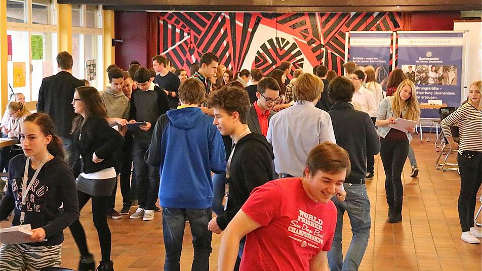 "Wir wollen den Schülern die Möglichkeit geben, sich selbständig über Berufe und Berufsfelder zu informieren", schrieben die vorgenannten Pädagogen in ihrer Ankündigung. Wie der Berufsalltag aussehe, darüber konnte mehr als ein Dutzend Eltern, Ehemalige und weitere Berufsausübende ganz persönlich Auskunft geben. Die 14 Beratungstische in der Aula waren am Freitagnachmittag von den 72 wissbegierigen Gymnasiasten gruppenweise umlagert.