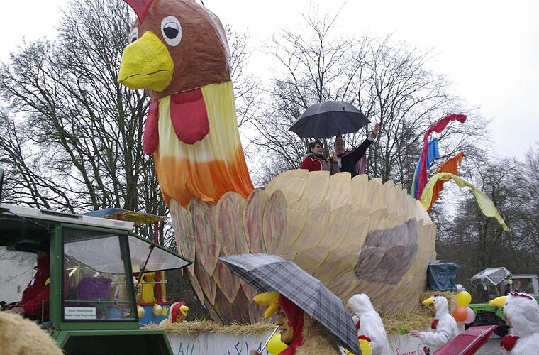 Im "Hühnernest" - von Hennen und Gockeln umschwirrt - fühlte sich das Prinzenpaar Julia und Daniel sichtlich wohl, und die "Elferratskappe" gebührte den Damen und Herren des erlesenen Gremiums. Die Garden der "Dance Generation" mit dem Almabtrieb und die "Wilde 14", die Amerika so sehr liebt, kamen ohne Regen-Capes oder Kapuzen nicht aus. Dazwischen tummelten sich die "Minions" des Jugendraums. Das Männerballett kam diesmal sogar mit einer Abrissbirne zum Thema Dorferneuerung.