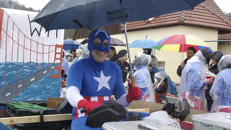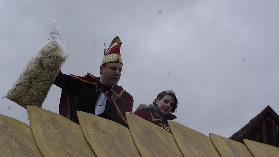 Matschige Bonbons in der Regenrinne, aufgeweichtes Popcorn in Plastiktütchen, von Wasser demolierte Kopfbedeckungen und Regenschirme als Fangbecken für Süßigkeiten - diesmal meinte es das Wetter nicht gut mit dem Auraer Rosenmontagszug, der mitten in einem ausgiebigen Regenguss startete.