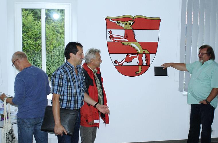 Beim Ortstermin erläuterte Bürgermeister Peter Hart zunächst die Details im Außenbereich. Der Schriftzug Rathaus ziert die Westseite neben dem behindertengerechten Eingang, das Gemeindewappen aus Metall soll hier in Kürze folgen. Die gemauerte Einfassung vor dem Zugang ist einem noch zu pflanzenden Baum zugedacht.