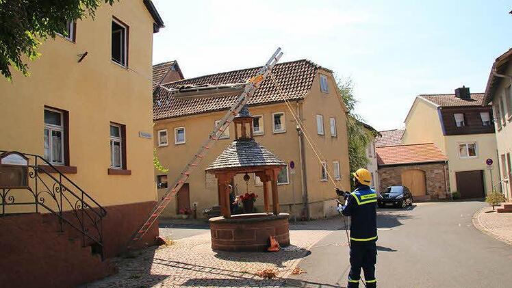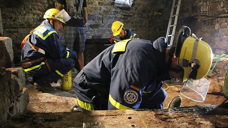 Chaos nach Rohrbruch Besondere Herausforderungen warteten im Dachgeschoss des Hauses wo eine Person mit Hilfe des Leiterbocks durch den Kaminschacht herabgelassen wurde sowie im Keller des Hauses. Hier bot sich den Einsatzkräften neben einem teilüberfluteten Keller aufgrund eines Rohrbruches eine unter Trümmern schwer eingeklemmte Person. Die Person wurde nach Rücksprache mit dem Notarzt mit Hilfe der Hebekissen schonend gerettet. Der Keller wurde im Anschluss ausgepumpt.