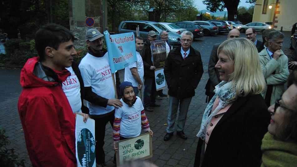 Das Thema Nationalpark spielte auch eine Rolle. Landrat Thomas Habermann (Rhön-Grabfeld) nutzte den Festakt fast schon für philosophische Gedanken. Einen kleinen Teil der Rhön sich selbst zu überlassen, mache Sinn, wenn man bereit sei, tatsächlich auf etwas zu verzichten und nicht schon wieder einen Wachstumsgedanken im Hinterkopf zu haben. Habermann würdigte die Unterstützung des Freistaates für den Naturpark, ohne die der Tourismus nicht so einen Aufschwung genommen hätte. Als Beispiel nannte er jährlich 150 000 Besucher auf dem Aussichtsturm am Schwarzen Moor. Gut könnten die beiden Landkreise damit leben, dass sie an der Finanzierung beteiligt sind. Dies stärke die Identifikation mit dem Projekt. Als nahes Zukunftsziel nannte Habermann die Schaffung einer Ladestruktur für Elektroautos und Nutzung solcher Fahrzeuge durch die Mitarbeiter. Beim Einzug der Ehrengäste hatten etwa 20 Gegner gegen die Schaffung eines Nationalparkes Rhön demonstriert. In den Reden spielte dieses Thema nur am Rande eine Rolle.