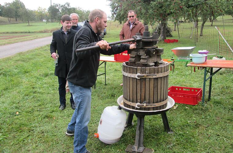 Für den praktischen Teil der Apfelsaftherstellung sorgten Christian Reusch, der Vize-Vorsitzende der Rhöner Apel-Initiative und Markus Stockmann, Vorsitzender des Kreisverbands für Gartenbau und Landespflege. Sie brachten eine Apfel-Presse und Säcke mit Früchten von den Streuobst-Wiese mit. Die Bürgermeister durften Äpfel spalten und zerkleinern. Die "Maische" kam in die Kelter, die Reusch zusammensetzte und bediente.