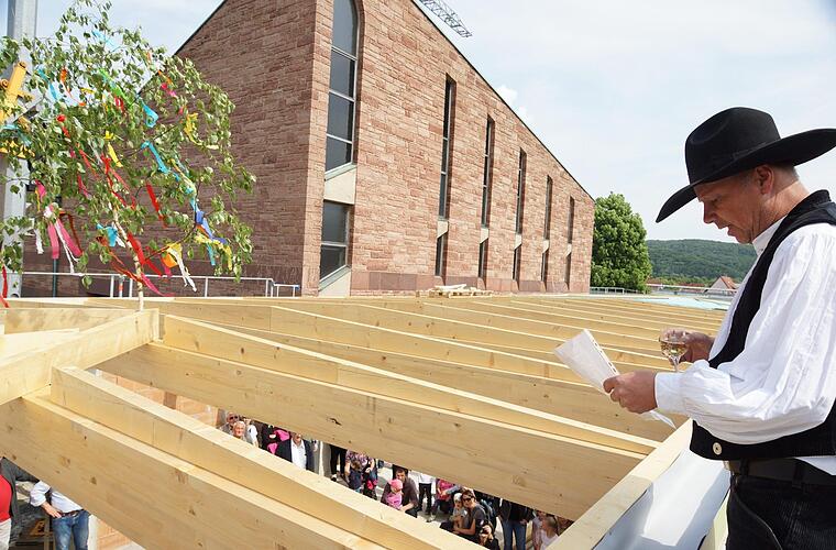 Ein halbes Jahr nach dem Spatenstich konnte die Gemeinde am Donnerstag bereits Richtfest feiern. Dabei hatte es vor zwei Wochen noch gar nicht danach ausgesehen, dass der Bau so weit wäre. "Auf einmal hatten wir dann Mühe, den Termin für das Richtfest so zu setzen, dass das Dach nicht schon fertig gedeckt ist", sagte Pfarrer Robert Augustin.