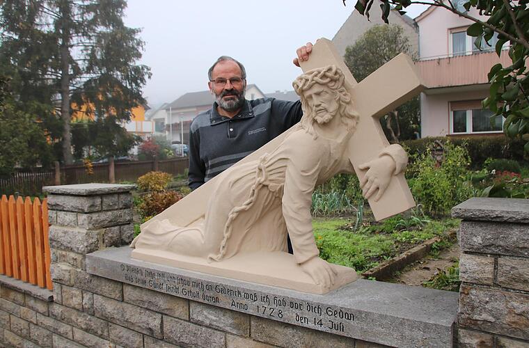 Für Rainer Sixt war diese Unterstützung ein Glücksfall: Der Bildstock steht seit Menschengedenken auf Privatgrund, früher der Familie Metzler, jetzt Sixt. Sein Vater Elmar Sixt (91) habe die Figur schon mehrfach überarbeiten lassen, zuletzt diesen Sommer. Zur 900-Jahr-Feier der Gemeinde sollte der Kreuzschlepper wieder gut da stehen.