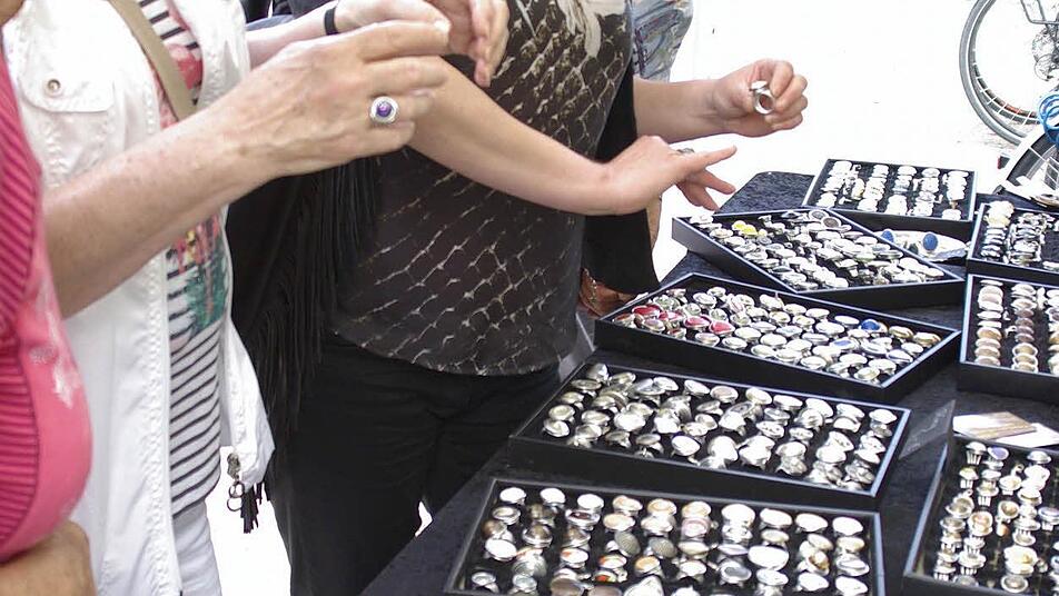 Die Email- oder Perlmutt-Knöpfe müssen natürlich mit Ösen versehen sein, durch die sie zum Tragen einen Alu-Draht führt. "Bei Anhängern ist es etwas schwieriger, weil ich den Draht verkleben muss. Die müssen auch einen Karabinerhaken haben", klärt die Hobby-Schmuckdesigner auf. Ihre schillernden Schmuckstücke stoßen bei den Damen auf großes Interesse.