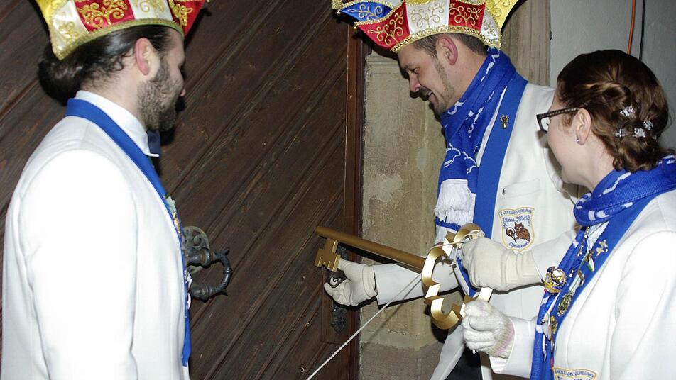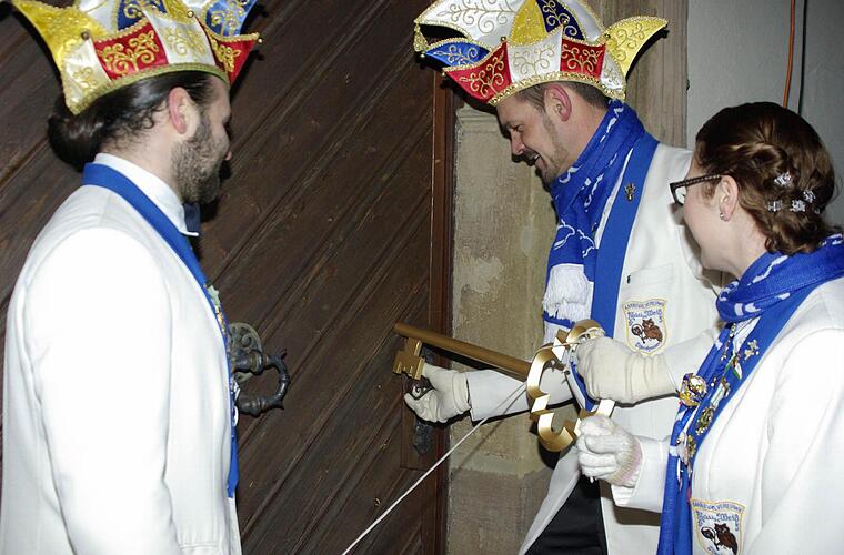Da wurden die Verteidiger kleinlaut. "Um Gnad bitt ich, ja kein Feuer. Der Wiederaufbau kommt uns zu teuer. Wir weichen eurer Übermacht, die Rathaustür wird aufgemacht", flehte der Amtsinhaber und ließ den Rathausschlüssel vom Fenster hinab, den die blau-weißen Elferräte johlend in ihren Besitz brachten, die Treppe hinauf stürmten und die Verteidiger in Fesseln legten.