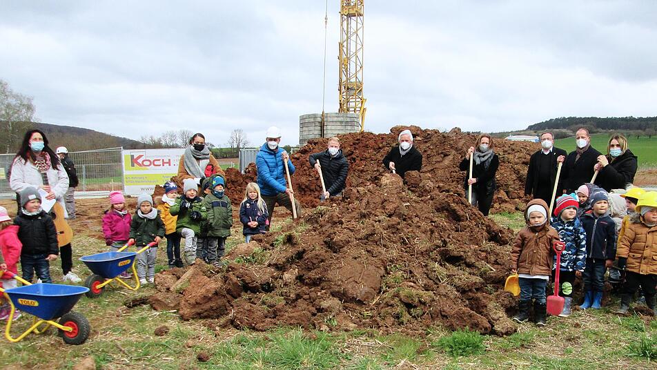 Zugrunde liegt dem Neubau ein Antrag des Kindergartenvorstands, der im Januar 2018 einen Erweiterungsbau des bestehenden Objekts anstieß, das inzwischen aus allen Nähten platzte. Der Gemeinderat entschloss sich nach längeren Beratungen beim Vor-Ort-Termin zunächst für eine Wirtschaftlichkeitsberechnung durch das Architekturbüro Thomas Ruser. Das Ergebnis der Studie: Die sinnvollste Lösung wäre ein kompletter Neubau. Dem stimmte der Rat zu und begab sich auf die Suche nach einer Notunterkunft für die Kinder, die er im Pfarrheim fand, dank Einwilligung von Pfarrer Norbert Wahler und der Kirchenverwaltung. "Der heutige Tag ist ein guter Tag für die Kinder und ihre Familien", unterstrich Bürgermeister Johannes Krumm bei der Besichtigung des Geländes, das derzeit die heimische Baufirma Koch bearbeitet. "Wir können als Gemeinde nichts Besseres tun, als in die Zukunft unserer Kinder zu investieren. Sie sollen künftig im neuen Kindergarten fröhlich spielen und für ihr weiteres Leben lernen können", fügte der Rathausobere hinzu. Die Jüngsten, die zum Spatenstich mit Schaufel und Schubkarre eintrafen, stimmten - mit Kindergartenleiterin Baster und den Erzieherinnen - das Lied von den "fleißigen Handwerkern" an. Der geplante Einzug in den Neubau ist für Frühjahr 2022 vorgesehen. Geplant sind 50 Kindergarten- und 15 Krippenplätze. Die aktuelle Baukostensumme liegt bei 2,8 Millionen Euro. Der Freistaat Bayern fördert das Projekt mit etwa 1,1 Millionen Euro. Bürgermeister Krumm gab den Kindergartenkindern einen Vers mit auf den Weg. "Hier soll er bald stehen und mit euch ein Stück Lebensweg gehen. Ein Ort, an dem Freundschaft und Zusammenhalt nicht zu kurz kommen sollen. Hier werdet ihr Kinder viel Neues erleben und mit Lachen und Freude den Grundstein für euer weiteres Leben legen."