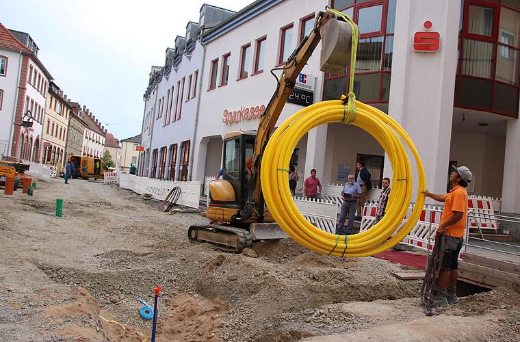 Los ging es mit dem Abschnitt vom Marktplatz bis zum Bürgerspital: Zunächst wurden die Kanal-Hausanschlüsse in einer Tiefe von bis zu vier Metern erneuert. Dann waren die Stadtwerke am Zug: "Alle alten Gas- und Wasserleitungen kommen raus", berichtet Geschäftsführerin Anja Binder. Die Verlegung betreut Matthias Feiler, der für die Gas- und Trinkwasserversorgung zuständige technische Betriebsleiter der Stadtwerke. "Wir ziehen die Anbindungen bis in die Seitengassen", verweist er darauf, dass über die Grenzen der eigentlichen Bahnhofstraßen hinausgebaut wird, um auf Nummer sicher zu gehen. Schließlich ist geplant, den Untergrund der Bahnhofstraße mit einer 25 Zentimeter dicken Betonschicht zu befestigen und zu pflastern. Deshalb wird alles getan, dass es keine Schäden im Untergrund gibt, sondern im Zweifelsfall eher in den angrenzenden Gassen.