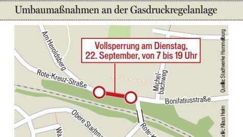 Fest terminiert ist dagegen der Umbau der Gasdruckregelanlage in der Rote-Kreuz-Straße: Kommenden Dienstag, 22. September, soll alles über die Bühne gehen. Die Stadt hat dafür eine Vollsperrung von 7 bis 19 Uhr in Höhe der Einfahrt Am Heroldsberg auf einer Länge von rund 60 Metern bis zur Einfahrt in die Bonifatiusstraße und zur Brücke über die Bahnschiene angeordnet. Der Gehweg im Baustellenbereich soll jedoch benutzbar bleiben. Alle angrenzenden Straßen sind bis zur Baustelle für den Verkehr freigegeben, entsprechende Schilder weisen bereits weiträumig auf die Sperrung hin.