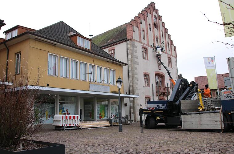 Während der Ausbau der Bahnhofstraße wegen des starken Frostes vorerst weiter ruht, fiel am Montag, 11. Januar, der Startschuss für den Umbau des ehemaligen Kaufhauses zum Bürgerhaus. Rund sieben Millionen Euro investiert die Stadt, um dort Tourist-Info, Sitzungssaal, Bibliothek, Volkshochschule und Büros unterzubringen. Mehrere Jahre wurde geplant, im vergangenen Jahr hatte die Klage von Nachbarn das Projekt erneut verzögert. Beide Parteien einigten sich auf Änderungen. Nun soll das Bürgerhaus im Frühjahr 2023 öffnen.