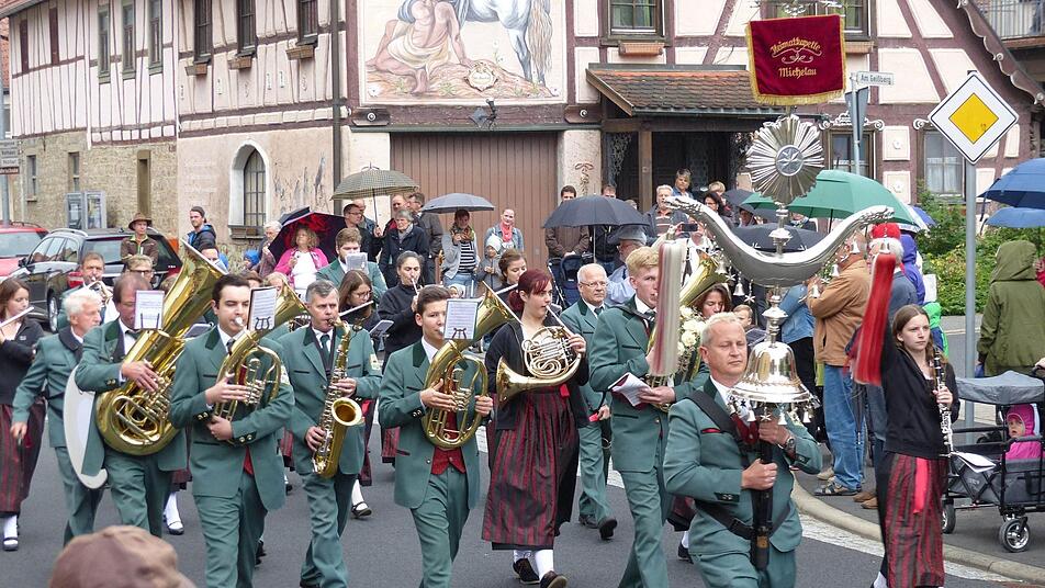 Wenn es trotz leichten Regens die Leute auf die Straße zieht, dann muss das schon einen gewichtigen Grund haben. So war es auch beim Sternmarsch zum 50-jährigen Bestehen des Musikvereins in Greßthal der Fall: Mit den Fuschter Musikanten, der Trachtenkapelle Theinfeld, den Steinwaldmusikanten Pullenreuth, der Heimatkapelle Michelau, der Musikkapelle Gauaschach sowie dem MGV Brebersdorf/Kützberg hatten sich etwa 150 Musikanten anlässlich des 50-jährigen Jubiläums an verschiedenen Plätzen im Ort jeweils zu einem kleinen Platzkonzert aufgestellt. Mit Polkas, Märschen oder Volksliedern lockten sie die Einwohner aus ihren Häusern, bevor sie bei leichtem Regen durch die Dorfstraßen zum Festzelt am Sportplatz marschierten, wo zahlreiche Gäste applaudierten.