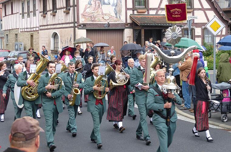 Auch der Sonntag stand im Zeichen der Blasmusik. Bereits zum Frühschoppen spielten die Steinwaldmusikanten Pullenreuth auf. Nach dem Mittagessen traten jeweils eine Stunde lang der Musikverein Schwemmelsbach, die Musikfreunde Wasserlosen sowie die Musikkapelle Wülfershausen auf, bevor die Jubiläumsparade mit den Blaskapellen aus Altbessingen, Machtilshausen, Waigolshausen, Theilheim und Riedenberg durchs Dorf ins Festzelt zog. Das kam zum Beben als die Musikanten auf die Bierbänke stiegen und gemeinsam mit Liedern wie "Auf der Vogelwiese", "Böhmischer Traum" und dem "Frankenlied" die Besucher zum Mitsingen mitrissen. Schließlich traten noch die Blaskapellen aus Waigolshausen, Theilheim, Altbessingen und Sömmersdorf auf und weckten die Lust an der Blasmusik.