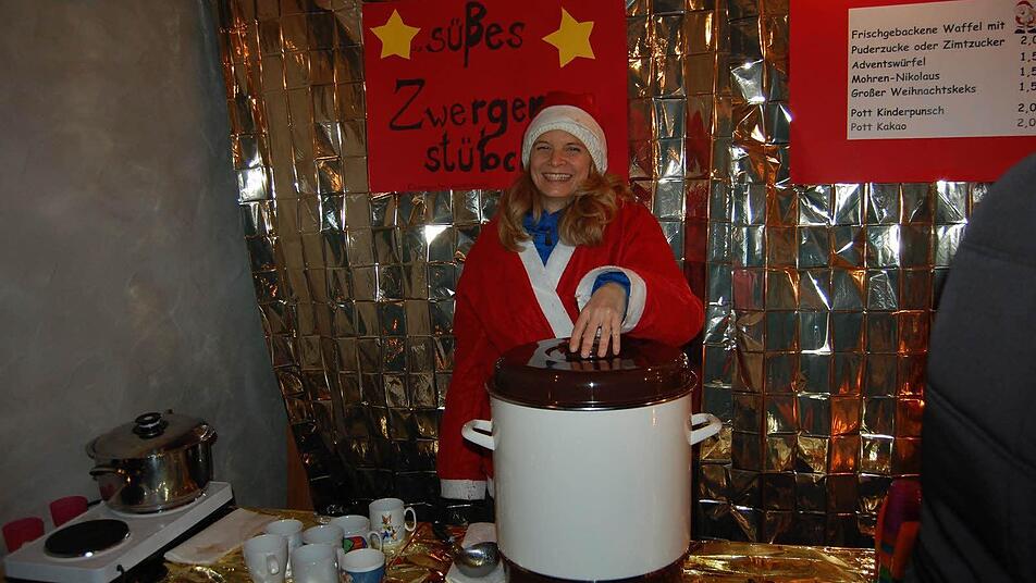 Gulaschtopf, Bratwürste, Glühwein und die beliebte Feuerzangenbowle fanden reißenden Absatz. Im Zwergenstüble des Kindergartens sorgten hübsche Zwerge für ebenfalls leckeren Glühwein und Zimtwaffeln. Zu später Stunde wurde auch die Kellerbar geöffnet, und die Gäste konnten sich auch dort in dem historischen Keller gemütlich unterhalten. Dass auch die weihnachtliche Atmosphäre passte, dafür sorgten die Kinder des Hassenbacher Kindergartens mit ihrer Betreuerin Nadine Dunkel und einigen Eltern. Aus den jungen Kinderkehlen erklangen Lieder wie "Lasst uns froh und munter sein" und "Im Advent", aber auch ein lustiges Gedicht erzählten sie den aufmerksamen Zuhörern. Auch die Hassenbacher Musikanten ließen weihnachtliche Weisen am Abend erklingen.