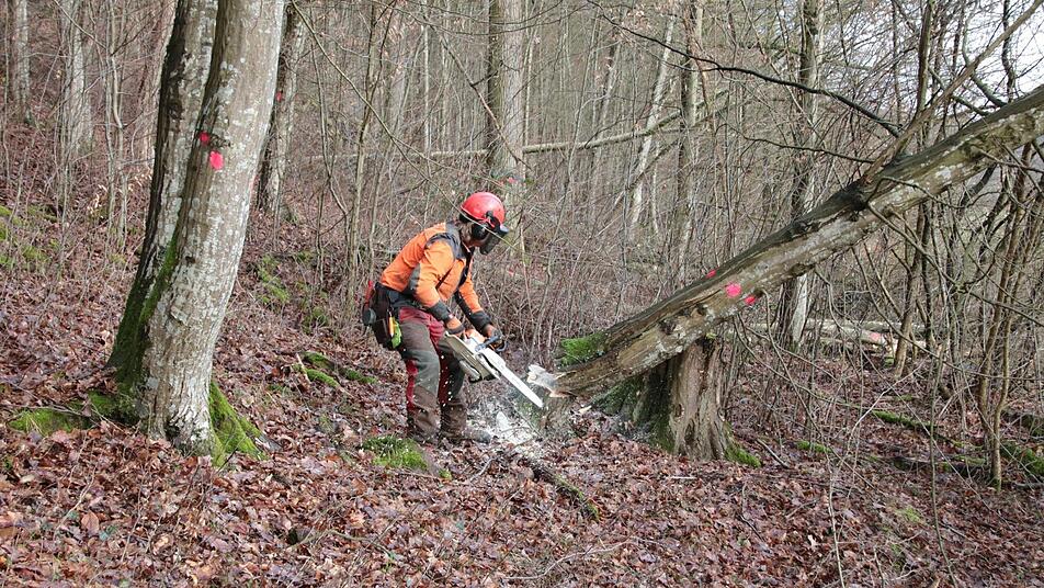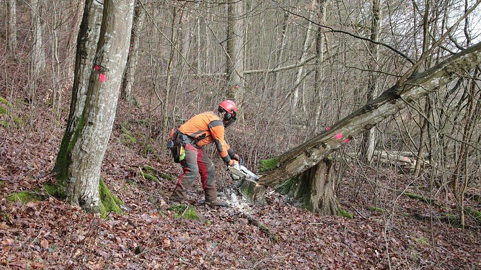 Wenn alle Bäume liegen, die auf die Straße fallen könnten, könne zum einen das erste Holz aufgearbeitet und abgefahren werden, zum anderen wollen sich die Forstwirte dann den Hang hinauf arbeiten. Revierförster Rainer Bräunig rechnet mit einem Holz-Einschlag von insgesamt bis zu 800 Festmetern. "Wir wollen sehen, dass wir das Holz gleich wegbekommen und auch gleich die Straße sauber machen."