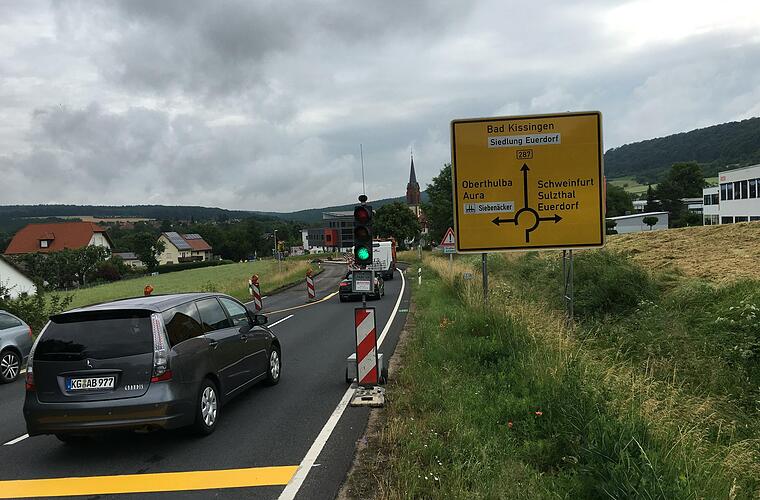 Auf der B 287 zwischen Bad Kissingen und Hammelburg sowie an den Zufahrten nach Aura und Euerdorf kommt es deshalb zu Behinderungen. Aktuell wird der Ast Richtung Aura ausgebaut, die Zufahrt ist gesperrt, an den anderen drei Ästen wird der Verkehr durch Ampeln geregelt.