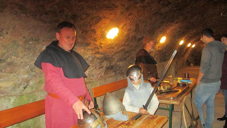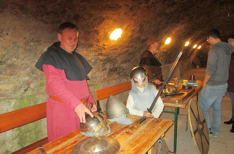 Gottlob ist die Trimburg mit Räumen ausgestattet, die Schutz vor Unwetter und Regen bieten. Im Gewölbekeller präsentierten die Organisatoren Exponate wie Schwerter, Helme und Kettenhemden und anderes, die einst die gefürchteten Nordmänner trugen. Wahler und der kundige Wikingerexperte und Ablassprediger Jürgen, erläuterten die Ausstellungsstücke.