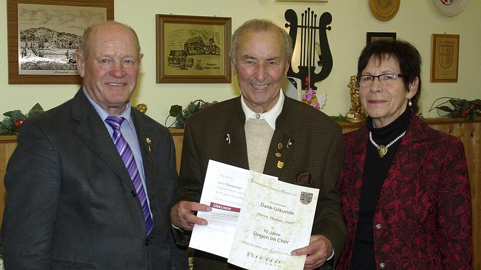 Das gab es noch nie bei der MGV-Chorgemeinschaft: In der Jahresabschlussfeier im Vereinsheim ehrten der Fränkische Sängerbund (FSB) und der Deutsche Chor-Verband (DCV) mit Thomas Auer einen Sänger für 70 Jahre aktiven Gesang.