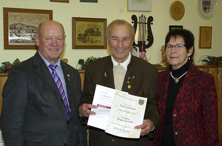 "Der Gesangverein steht für mich immer noch an erster Stelle", beteuert der rüstige Sänger, dessen verstorbene Gattin Irma ebenfalls Sängerin war und für lange Zeit das Amt der Notenwartin inne hatte. Was dem Jubilar im Gedächtnis geblieben ist, sind "die vielen Auftritte des MGV, die mich beeindruckt haben". Außerdem erinnert er sich daran, dass einmal an einem Abend 16 Männer in den Gesangverein eintraten, den damals der langjährige Dirigent, Hubertus Müller, leitete. Den Frauenchor gab es seinerzeit noch nicht. Der Stellvertretende Vorsitzende des Bezirks und des Sängerkreises Schweinfurt, Paul Kolb, zeichnete schließlich gemeinsam mit der Hammelburger Vorsitzenden, Edith Deinlein, die "treueste Seele" des MGV, Thomas Auer, für 70 Jahre aktives Singen mit der Ehrennadel und den Dankesurkunden des FSB und des DCV aus.