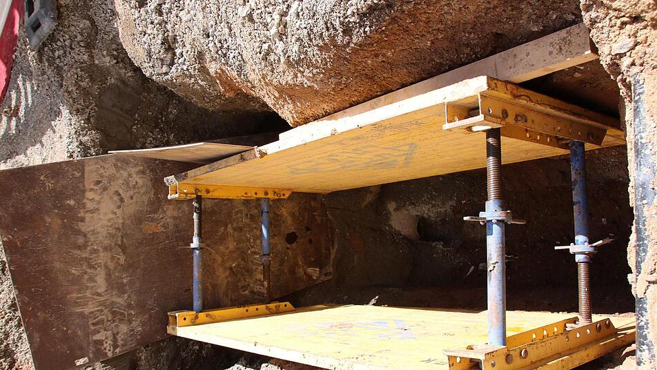 Ein tiefes Loch klafft am Anfang der Bahnhofstraße, Daniel Kirchner benötigt die gesamte Länge des Baggerarms, um die Erde von unten hoch zu holen und die Wände der Baugrube müssen abgestützt werden. Ganz unten sind der Haupt-Kanal und die Reste eines Hausanschlusses zu sehen. Der Haupt-Sammler sei erst Mitte der 1990er Jahren erneuert worden. "Den lassen wir drin", berichtet Peter Kreß von der Tiefbauverwaltung. Allerdings seien damals die Anschlüsse in die Keller nicht erneuert worden. Das werde jetzt überall dort, wo man gut hinkomme, nachgeholt. Alle anderen Leitungen würden über Kamerabefahrungen überprüft.