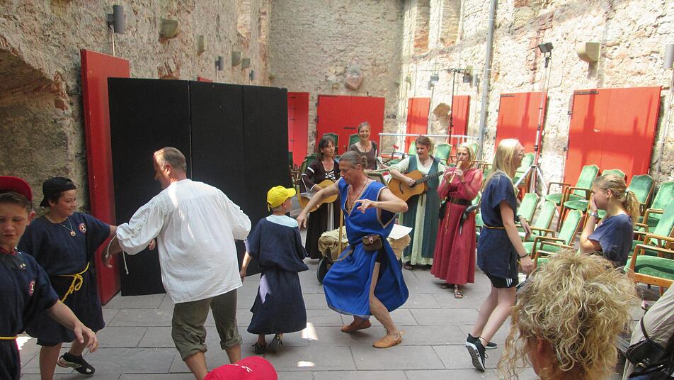 Angenehmere Seiten waren Gesang, Musizieren und Tanzen. Zur Vermittlung solcher Eigenschaften sind die Fuchsstädter "Troubadours" prädestiniert, die im nächsten Jahr ihr 25. Jubiläum feiern. Sie erklärten althochdeutsche Texte, sangen Lieder aus der Minne-Ära, tanzten mit den Kindern und verteilten einfach einsetzbare Instrumente mit denen die jungen Gäste Musik machen durften. Das Kochen gehörte ebenfalls zu den Aufgaben von Rittern und Knappen. Über einem Holzfeuer auf dem Rost gegart gab es üblicherweise Wild oder Huhn, diesmal waren es Bratwürstchen. Die Zuspeise, Nudeln, musste selbst aus Nudelplätzen geschnitten werden.
