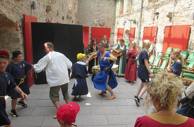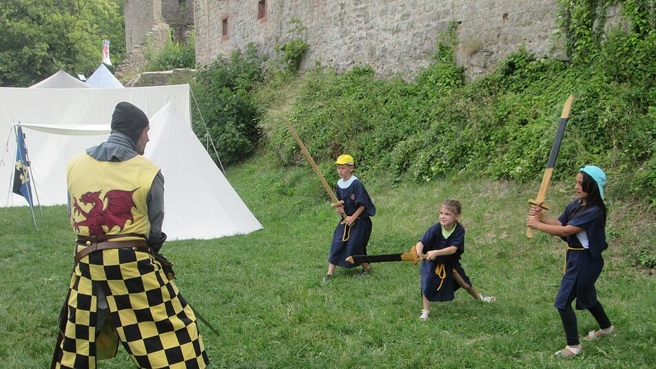Ihrer Zielsetzung treu, bietet die Trimburg Erwachsenen, Jugendlichen und Kindern Events durch die Veranstaltungen der Vereine "Freunde der Trimburg" und "musifit". Die Knappen-Schule für Mädchen und Jungen, die vor acht Jahren Einzug auf der Landmarke hielt, ist ein Mittelalter-Erlebnis, das die Trimburgfreunde ausrichten. Insgesamt 17 Kinder aus dem Nikol-Haus in Willmars und ihre Betreuerinnen waren diesmal Gäste, die sich hier in den Tugenden der Ritter üben durften. Schwertkampf, Bogenschießen, die Essenszubereitung, Musizieren und Tanzen sowie eine Führung durch die Burg gingen dabei Hand in Hand.